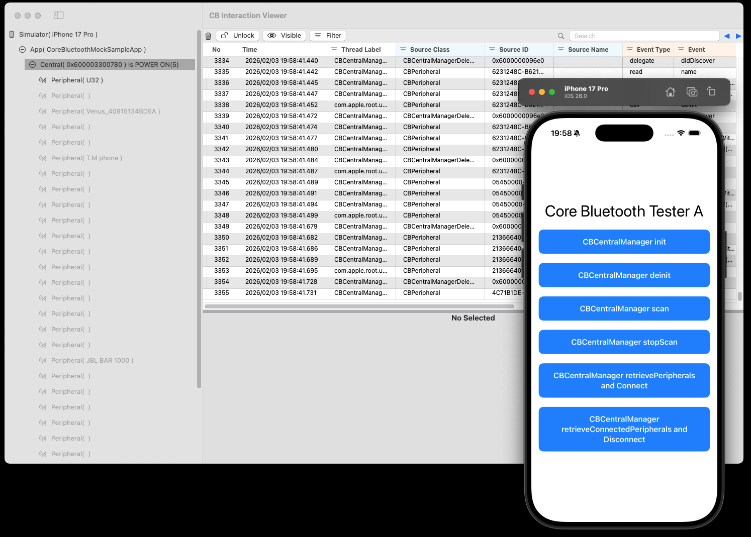 UI やアプリロジックの開発をシミュレータ中心で進めたい場合でも、CB Interaction Viewer を使えば 実デバイスとの BLE 通信を伴う動作確認が可能です。